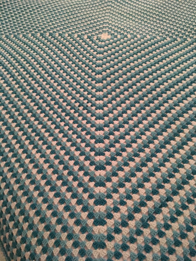 Next time, I think I would do in squares of a smaller size and stitch together. Granny Squares make up so quickly when small, but are a chore when large.