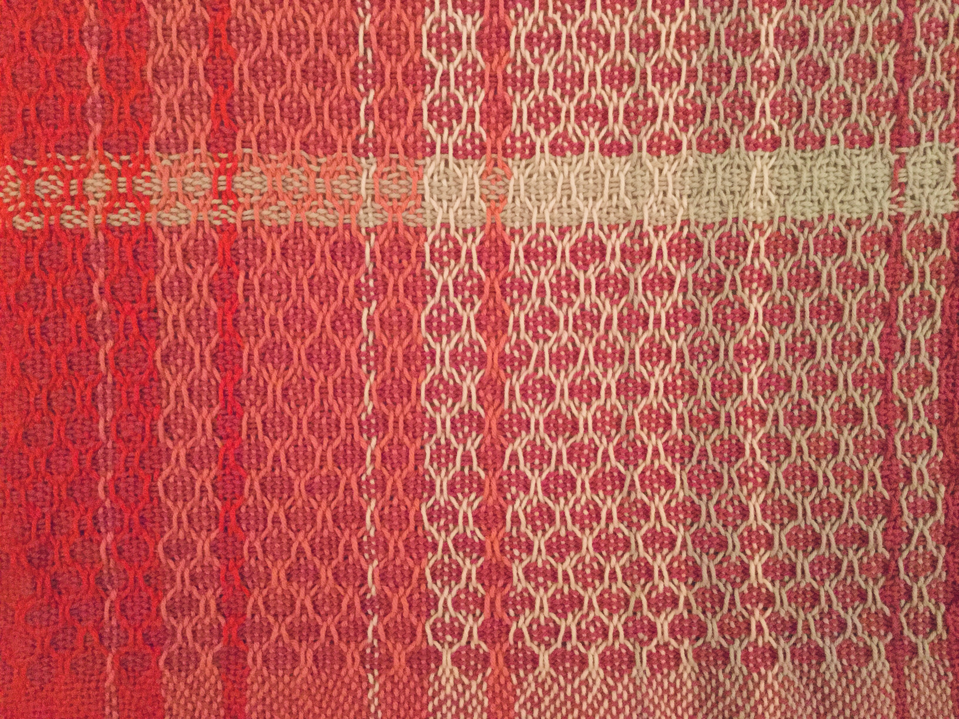 I completed the weaving at the weekend, but as I came towards the end, I could see I had miscalculated the length and would not be able to do the full repetition of the warp in the weft. And as I had done two pickup patterns, one end would now be a shorter section. Anyway, I made the best of a bad calculation and cut it from the loom after taking as close to the reed as I could, created the fringe and washed it. However, I misjudged the detergent and the machine ended up with too much foam. So I had to wait for that to drop and then rinse, which meant no softener. Ok, I thought, I’ll just tidy it up and then wash again with fabric softener. But after it dried and I was looking it over, I realised I had made an error on the pickup weave, duplicating a row. Just great! And I thought I had been careful.