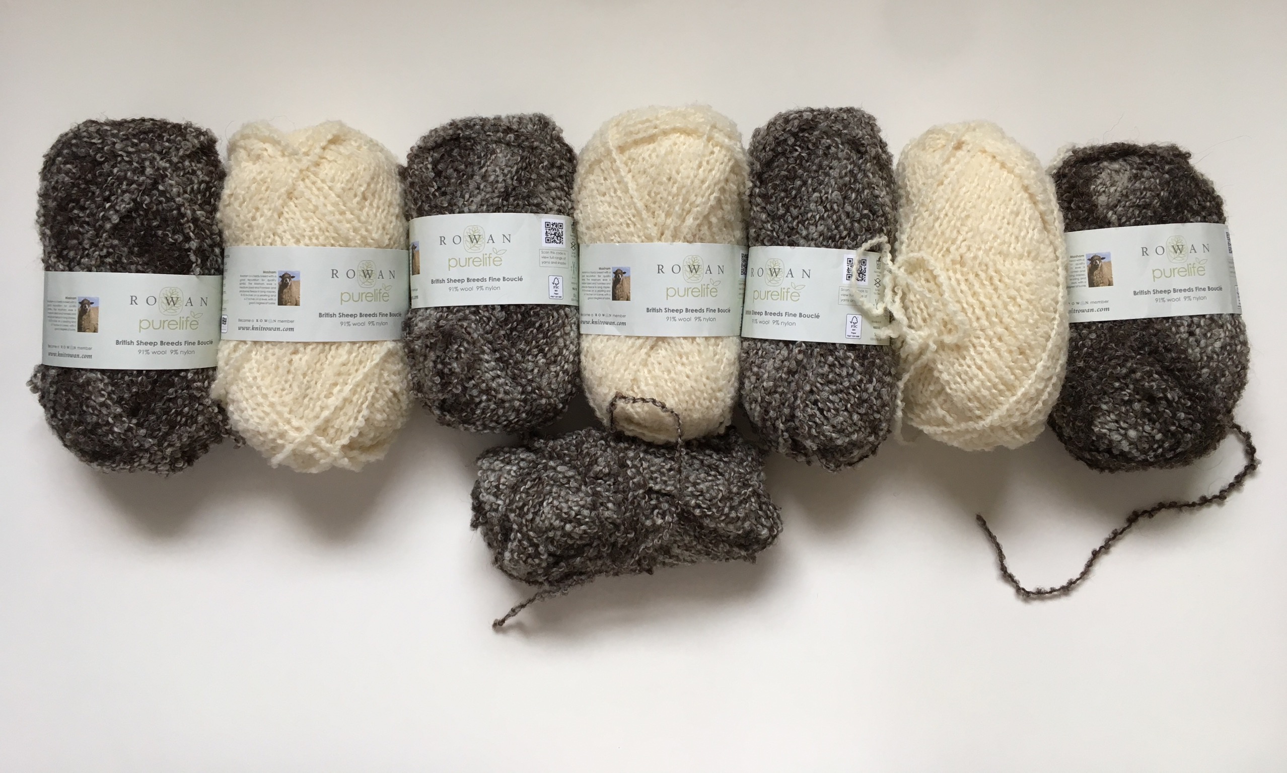 The first would be a bit of a jumble gradient. The colours have rather loose connections but it might work. I have more of the middle colour so it would be the widest section. The middle picture is some lovely bouclè yarn that I used for another blanket. That’s all I have left. I am thinking stripes with the remaining dark as a border edge. And the last, I have loads of the beige but just the one blue, so edging again unless I can think of something else.