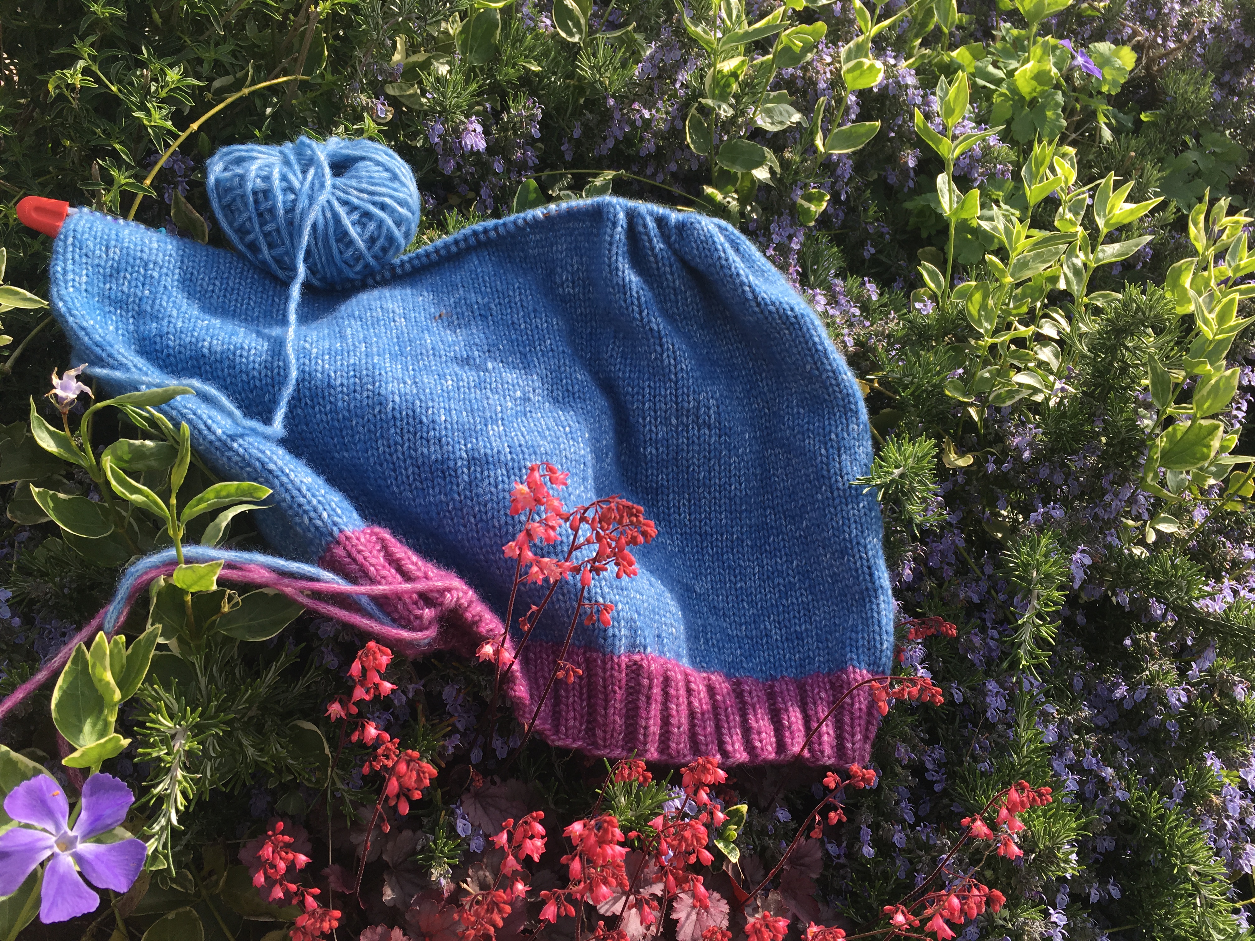 With this lovely day, it looks good amongst the Rosemary and against the Heuchera. Given this will be a jumper for the garden, it seems appropriate too. I am still thinking about the top of the jumper section. I had thought of doing the top including the shoulder of the sleeve in the purple colour. But I have toyed with adding some ribbing to the top instead. Is there a knit stitch that you can work that gives some form of pattern definition without going the whole ribbing route?