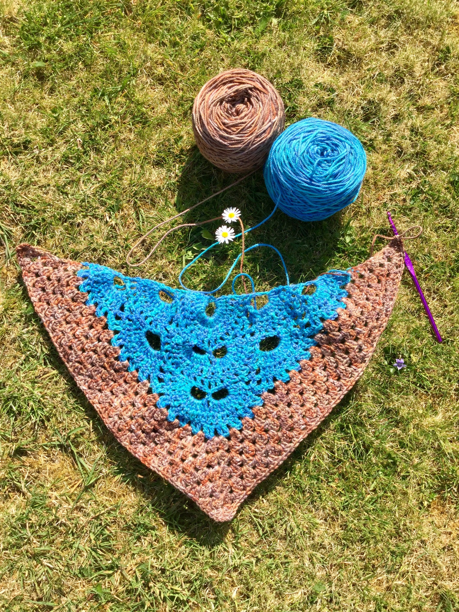The pattern is listed in Ravelry but without pattern, but is available as a YouTube video – Virus meets Granny shawl, I think. I am probably going to leave it as the single block of granny though.