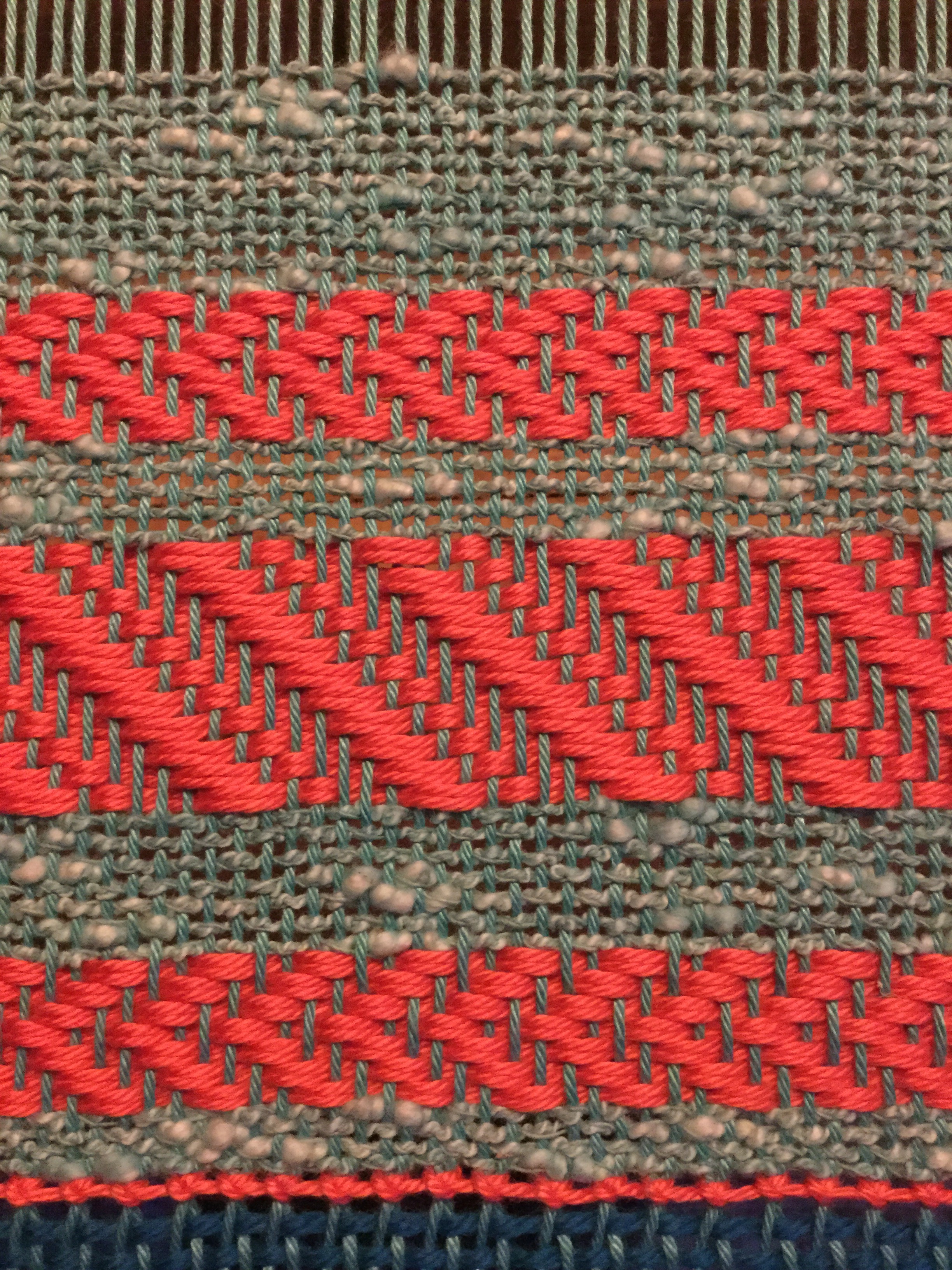 I like the pop of this rosey red against the green of the warp and weft. The slubby green cotton weft is coming on nicely. It is a fairly open weave and I am hoping that once off the loom and released from tension it will close up a little and then some in the wash. I am trying to think what it would be like to knit or crochet with this yarn. The slubs can be large is places and I can imaging that one of those within a stitch would look odd. Has anyone worked with a slubby yarn like this?