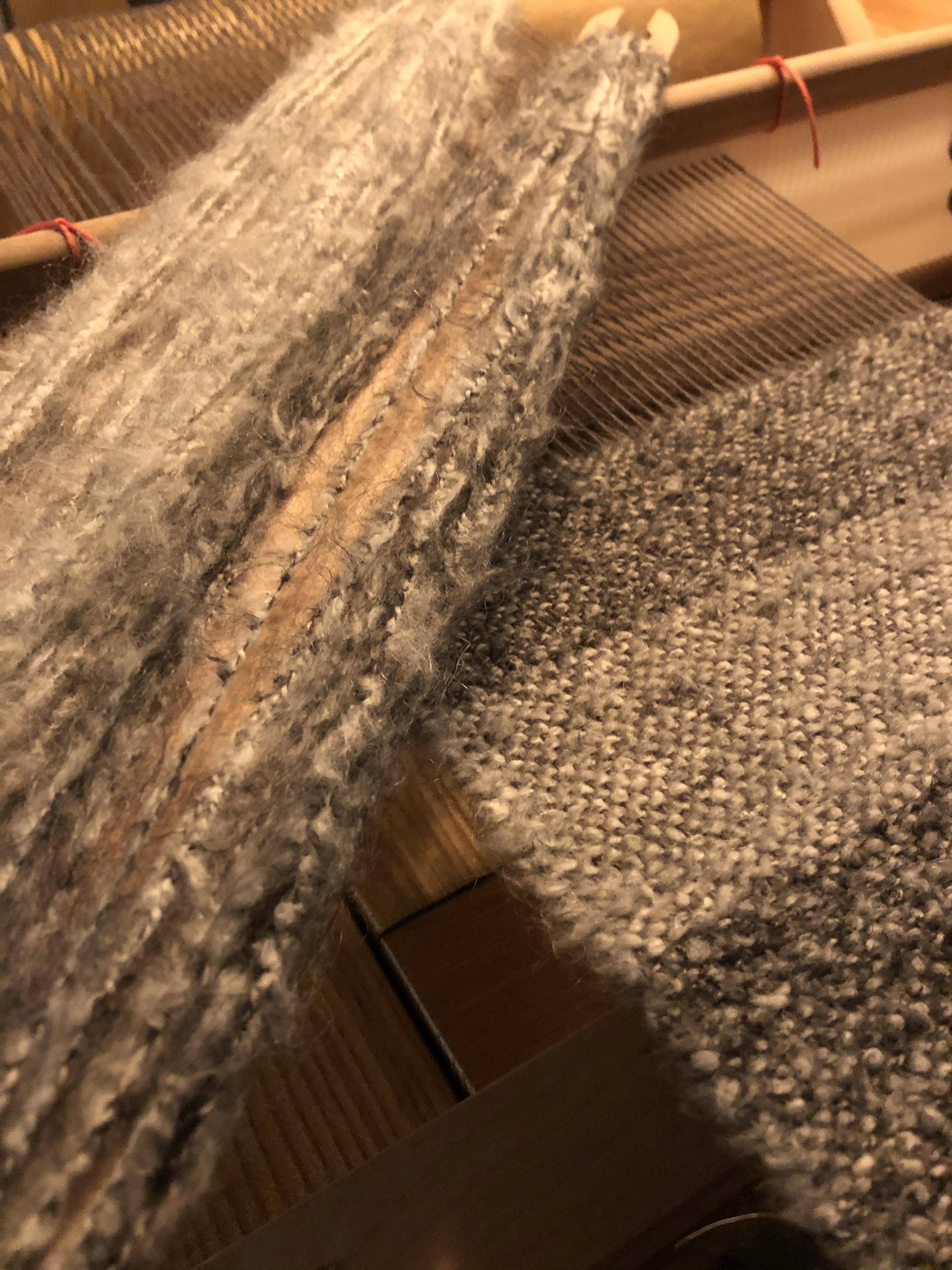 The yarn is a real mix of fibres. There is cotton, Merino, wool, elastase and polyester. The man made I think are just the core. It’s been paired with a 100% wool warp. It’s a little stretchy but it’s ok. But the colour was a perfect match for the furry weft yarn.