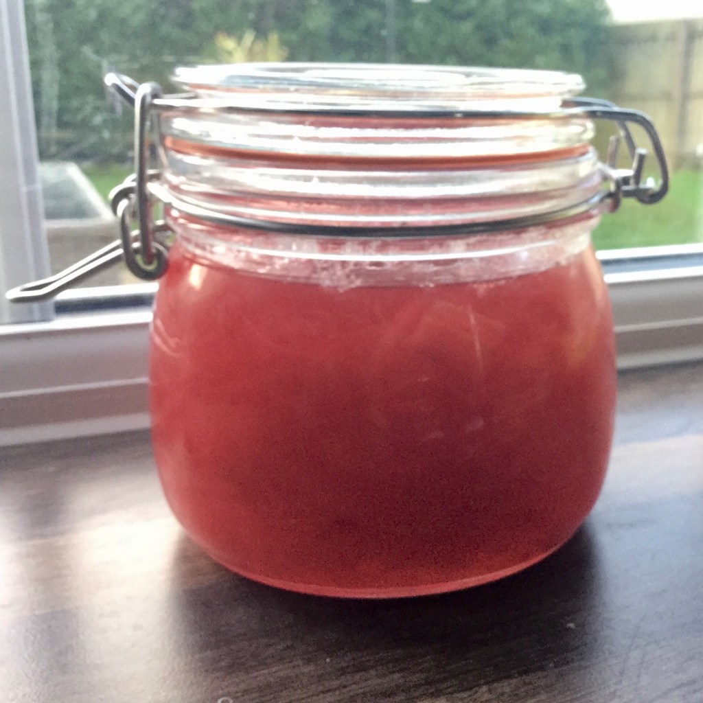 I had some errands to run on Thursday; the vet for the dog’s eye and then ironically, the opticians for my glasses. The varifocals they put in were completely wrong, despite me saying multiple times that the ones I wear have hardly any soft focus at the edges. That probably serves me right for going to a different one more local than my usual in the centre of Cardiff. But anyway, I also popped in to the food shop and saw those lovely, bright pink stems of rhubarb, so prevalent at this time of the year. I snapped up a bag.