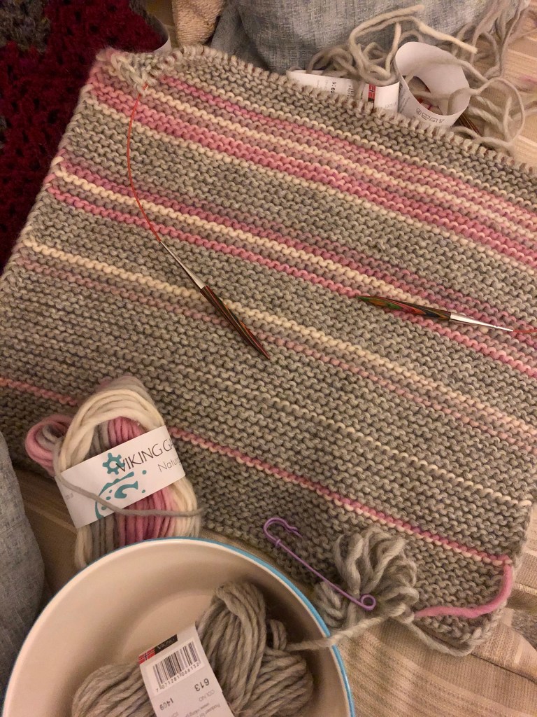 I finally made progress on my garter stitch blanket. I was so indecisive about a border or not. Different stitch sections or not. Then I thought should I do a cable type instead. My head was spinning. I frogged the last sample I showed and made another with an inset stockinette stitch border, but I didn’t like it.