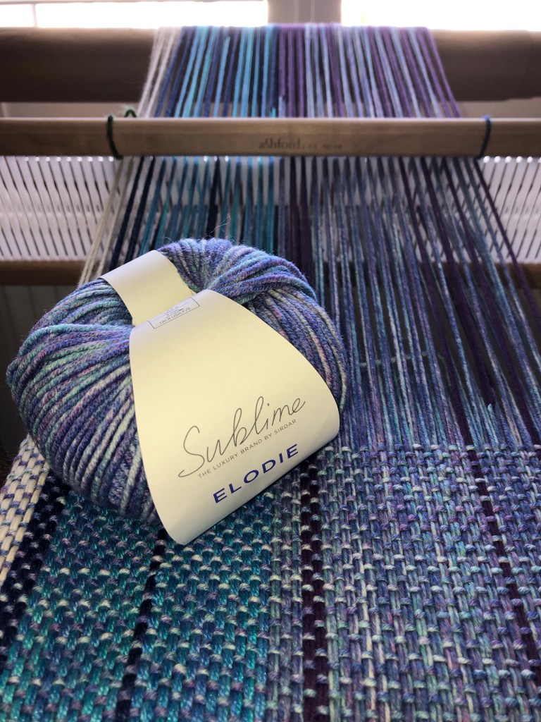 I added another warp to the loom. Using up more stash on Sunday evening, I went with clasped warp again. I started with the purples but found myself running low and I needed the Elodie for weft too.