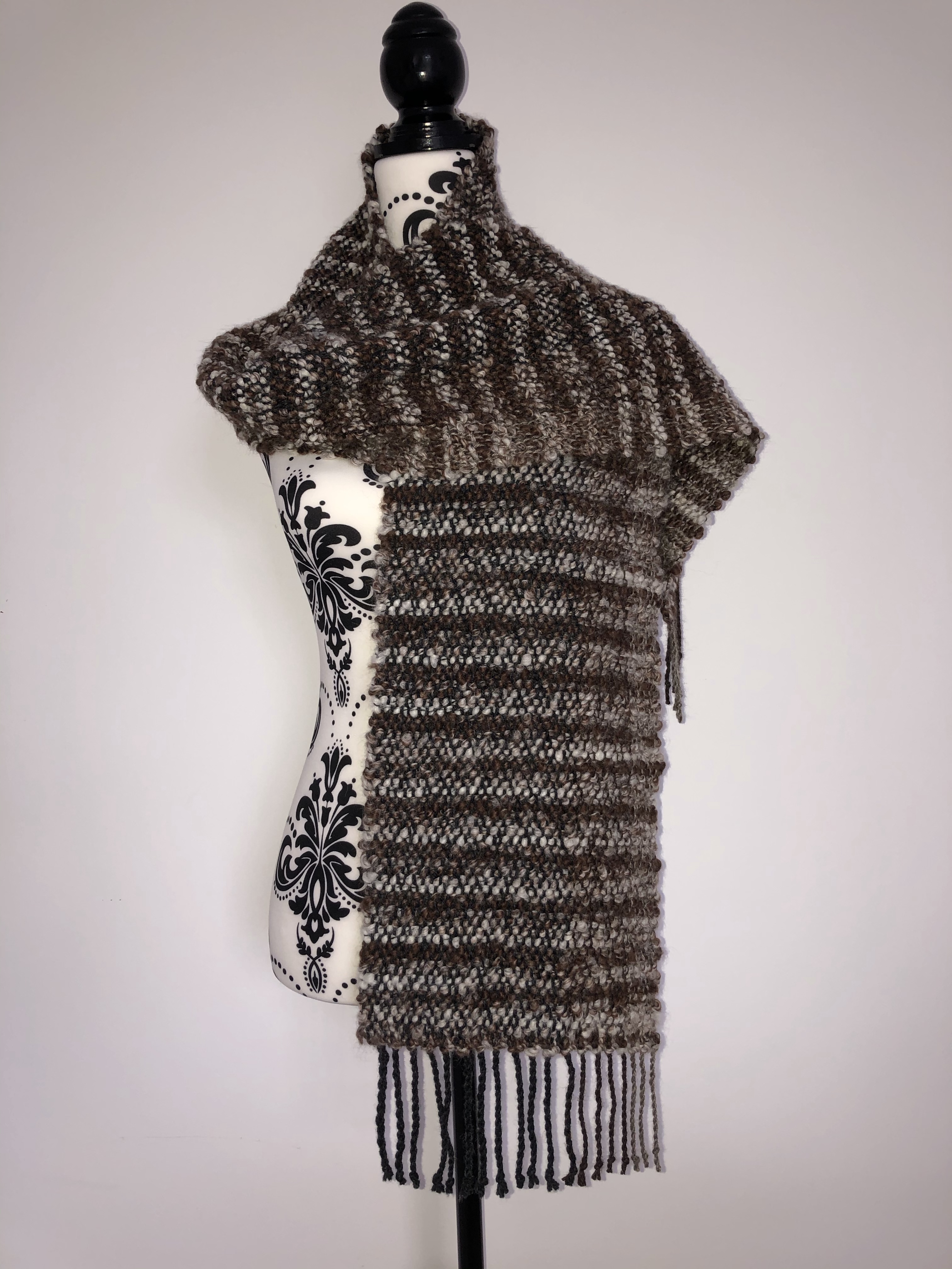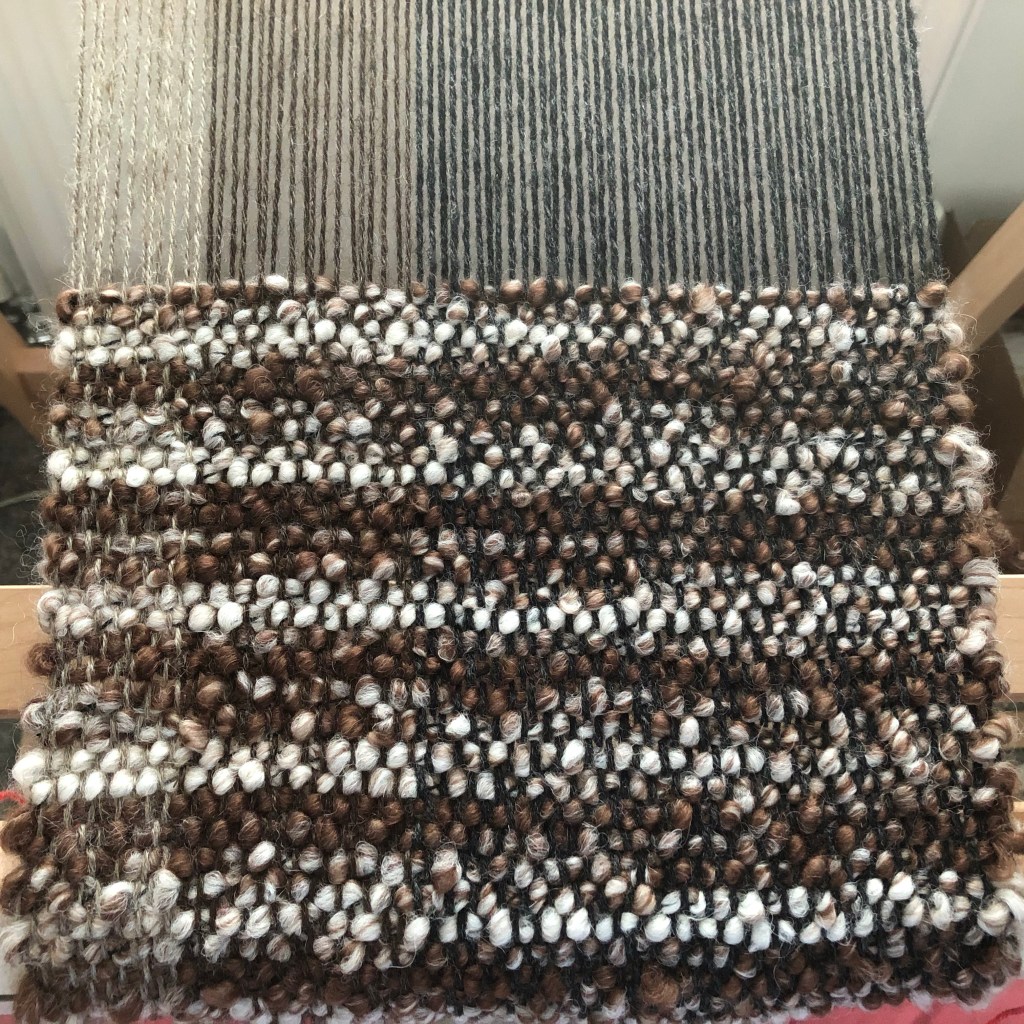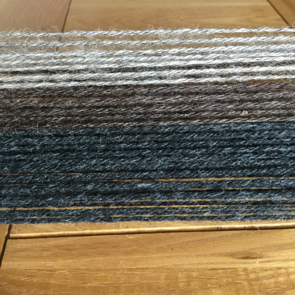 I used a variegated brown colour (the one at the front) as weft and a stash yarn of Navia in a black, adding the remainder of the Ystrad wool yarn that I had remaining from the last project.