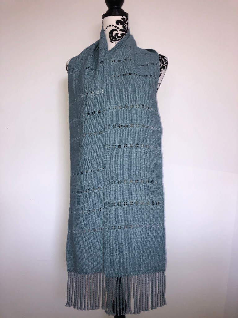 But waiting for fringe treatment once I know what I’ll do. This yarn can fray easy from cut ends, so knots are essential if the fringe is to work. If not, it will get the chop and turn and hem.