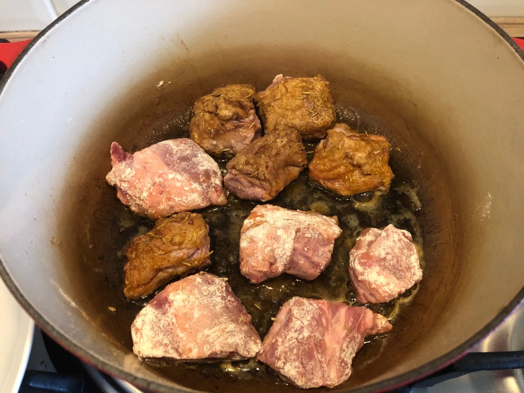 Drop into the pan, some of the dusted meat and let it gently colour, turning when needed. Not frequently else it won’t colour. And not too many at a time, else it will take longer. Remove to a bowl and repeat until all seared and lightly browned.