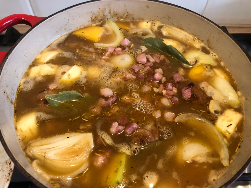 3. I would preheat the oven now. Add some butter if needed to replenish pan, then add roughly chopped chunks of root vegetables. I use turnip, carrot, parsnips and potato. If the potatoes/carrots are cleaned well, you can leave the skins on. don’t chop too small. Over three hours, the veg will lose some of its size. I add a roughly halved and quartered onion at the end. Turn the veg now and then to get some caramelisation which will add sweetness to the stew. Add some pepper and seasoning.