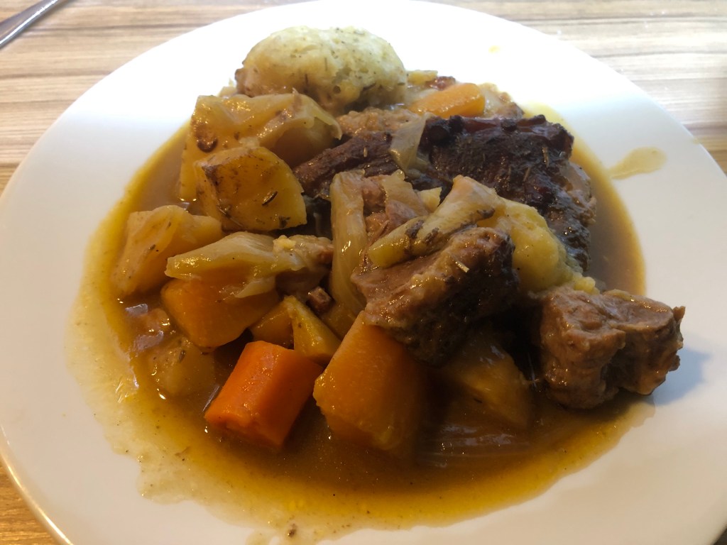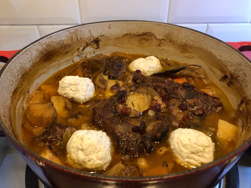 6. After 3 hours, remove from oven and stir. Add the dumplings and cook with the lid on if you like them soft, or lid off if you like them to crisp on top. Cook for 20 mins thereabouts.