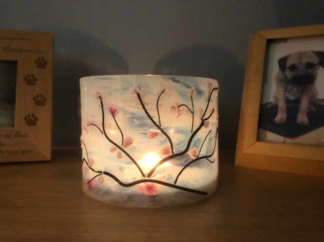 I made this at my first workshop. It is supposed to be a cherry tree branch in bloom. Its fairly abstract, but it looks lovely lit with a tea light behind. I gave it as a gift for a birthday present.