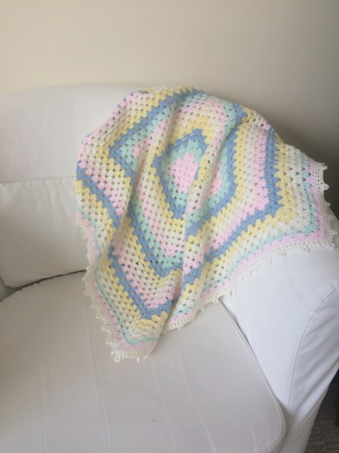 A little baby blanket, perfect for laying over the baby in a crib. It is still waiting for a good home. It was made with left over yarn in lovely ice cream colours.