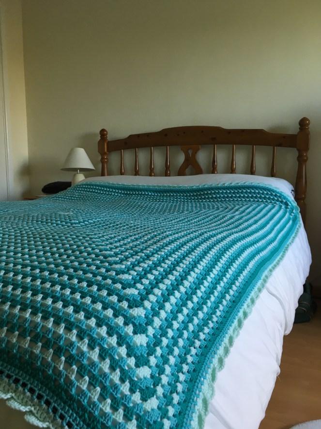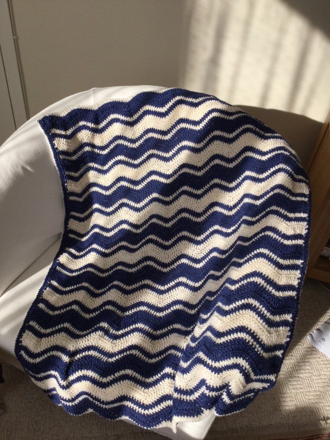 This blanket is made with a Merino blend. It is a baby sized blanket, nice and cosy and was given away as a new baby gift to a colleague.