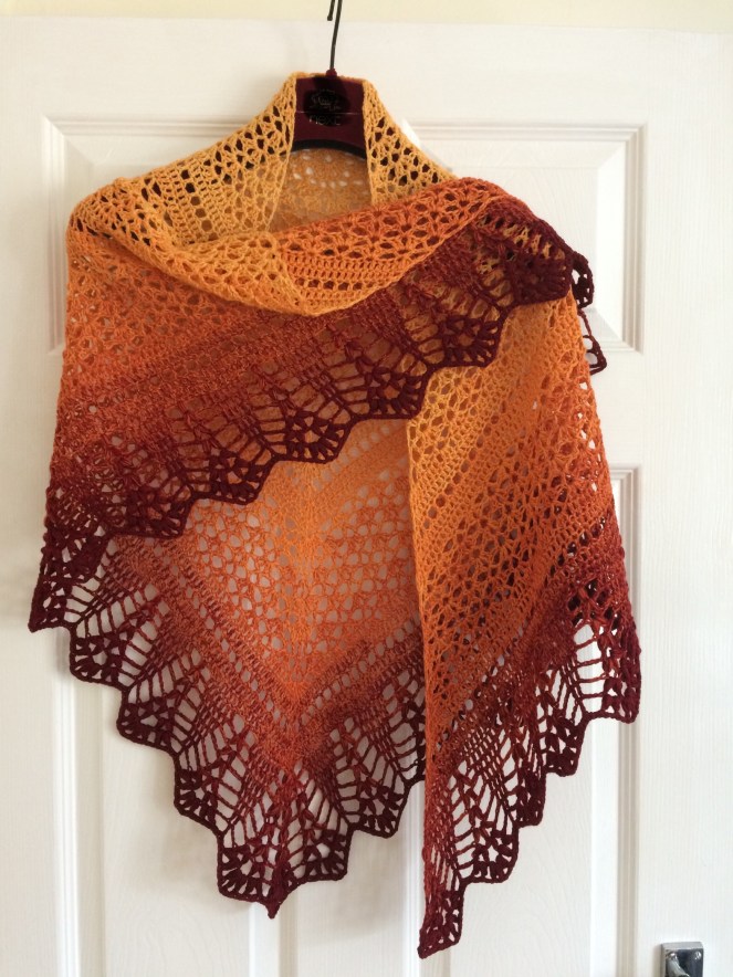 The Sunrise or Sunset shawl was to be a birthday gift, however I sold it instead. It’s a smaller shawl as the yarn cake was literally just enough. I wish I had purchased a larger one. It was made with yarn from Wollium and is a gradient yarn cake with the yarn comprised of individual un-plied threads.